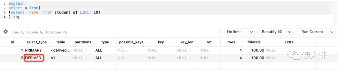 在 from 中包含子查询,会被标记为 DERIVED,会把结果放到临时表里,不过 mysql5.7+进行了优化。