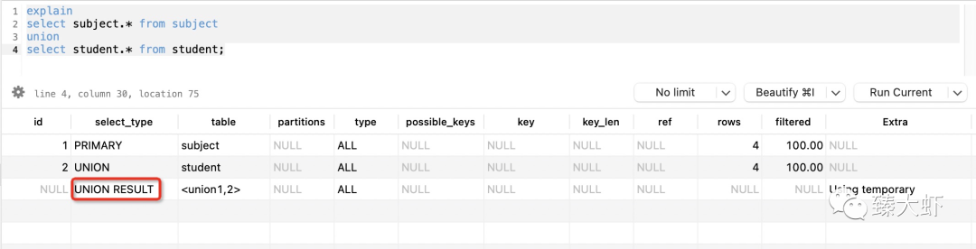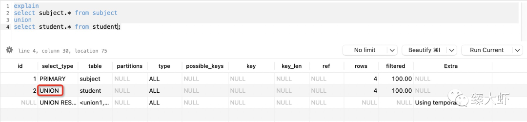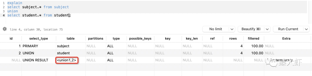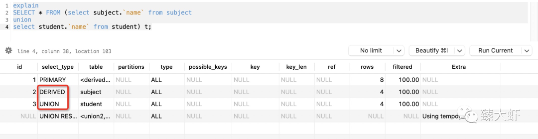 union 后面出现 select,那 select 这条查询会标记为 union;如果 union 包含在 from 的子句中,union 前面的 select 会标记为 derived