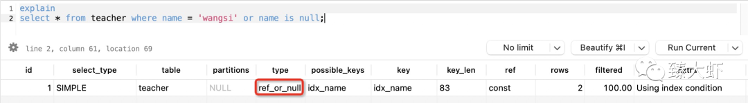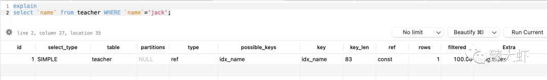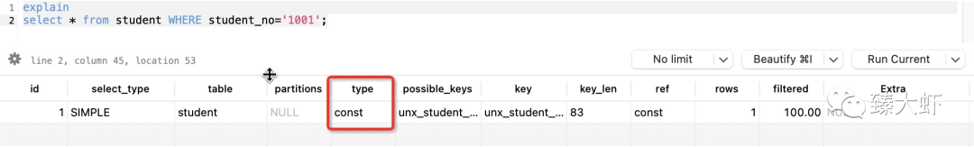ref | 显示索引的哪一列被使用了,可能是一个常数,常见的有: const、func、nul、字段名 |
