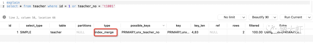 查询使用了两个以上的索引,可能使用索引合并优化的方法,就是说对于多个索引分别条件扫描,然后将各自结果合并(intersect/union),Mysql5.1 开始引入 index_merge.