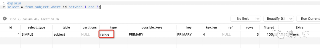 针对一个索引的字段,给定范围检索数据,在 where 语句中使用了:between...and、<、>、<=、in 等条件语句,查询 type 都是 range