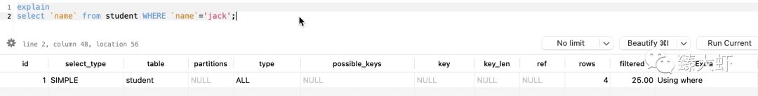 查询时没有找到可用的索引,从而通过 where 条件过滤获取结果