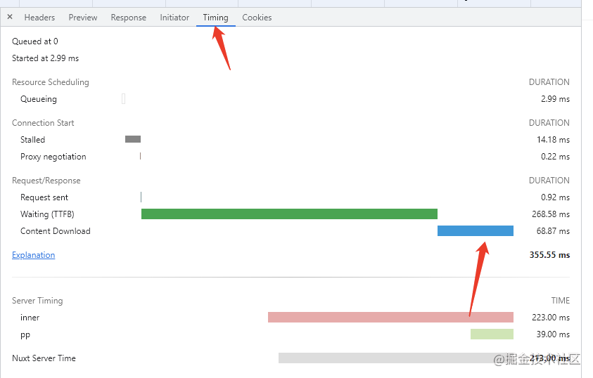 这么大的数据,光下载就需要耗费大量时间。如下图所示,是我请求juejin主页的某一个请求,其中的content download