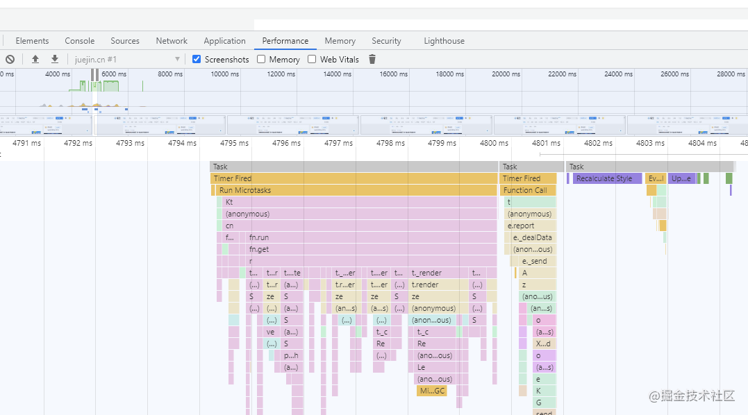 另外,有些服务的web页面,本身响应就非常的慢,这是由于业务逻辑复杂,前端JavaScript本身就执行缓慢。这部分代码优化,就需要前端的同事去处理了,如图,使用chrome或者firefox的performance选项卡,可以很容易发现耗时的前端 代码。