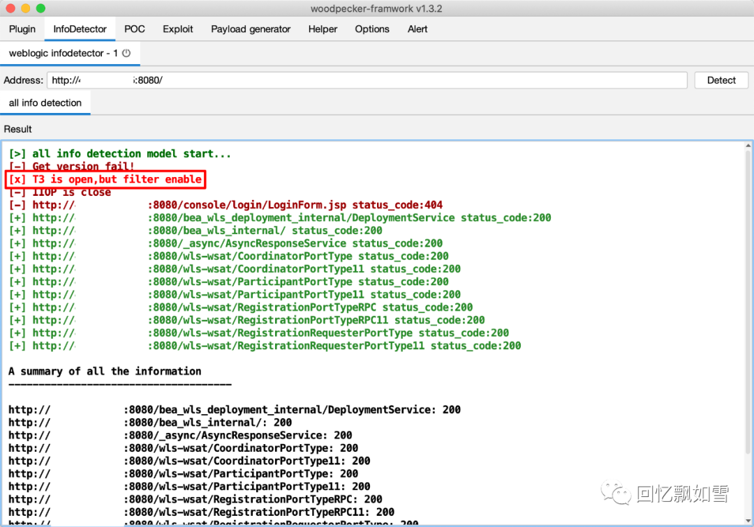 信息探测模块的任务是寻找当前应用最薄弱的点。显然有用的信息是判断的重要依据。这里探测的信息不是什么操作系,中间件,cms之类的指纹识别。而是针对具体应用的攻击面和风险点的探测,比如weblogic就会探测如下信息。
