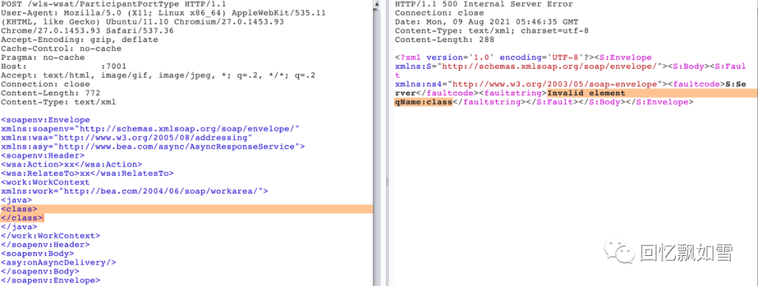 触发补丁检测就是提交可触发补丁的payload,然后看是否拦截来确定漏洞是否修复。比如CVE-2019-2725我们就可以发送带<class>标签的payload,若如下提示非法标签说明漏洞修复了。