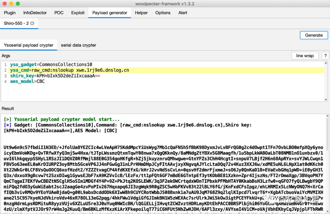 荷载生成模块的任务是帮助红队人员快速生成自定义payload。 自动化并不能解决所有问题,当遇到奇葩环境时就需要人工介入。比如当shiro漏洞遇到未知中间件时,可能无法回显也无法注入内存马,这时就需要人工构造payload了。但是每次都要先生成序列化数据,设置key,选择加密模式,非常浪费时间。而woodpecker shiro漏洞插件的荷载生成模块可以一键生成。