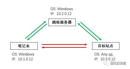 在做安服驻场时,连入客户内网对另一网段的站点进行渗透。有可能会遇到这种情况,虽然连入了客户内网,但无法直接访问目标站点。因为客户内网做了访问策略限制,不同网段无法直接连通。往往需要通过客户提供的跳板服务器去访问,大概的网络示意图如下: