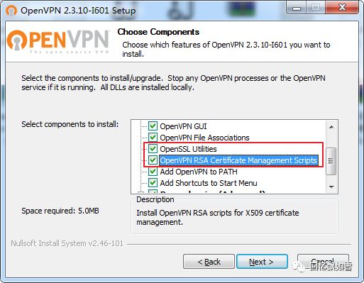 去官网下载OpenVPN(我下载是openvpn-install-2.3.10-I601-x86_64.exe),并在客户端和服务器按照以下同样的方式安装OpenVPN。安装过程没啥好说的,主要注意到以下这一步时,要选择红方框中的两个选项,不然安装完无法使用命令行制作证书。