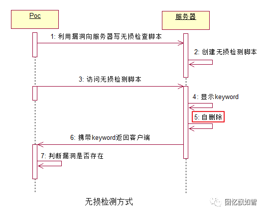 传统方式虽然能实现漏洞检测,但是缺点很明显,上传的txt文本残留在了服务器上,系统管理员很容易发现Poc检测过的痕迹,这样的检测是不优美的。而无损检测就是为了解决这个问题。无损检测上传的是无损检测页面脚本,该脚本会先输出keyword,然后自删除,也就是无损检查页面访问一次就自动删除掉了,不会残留在服务器上。