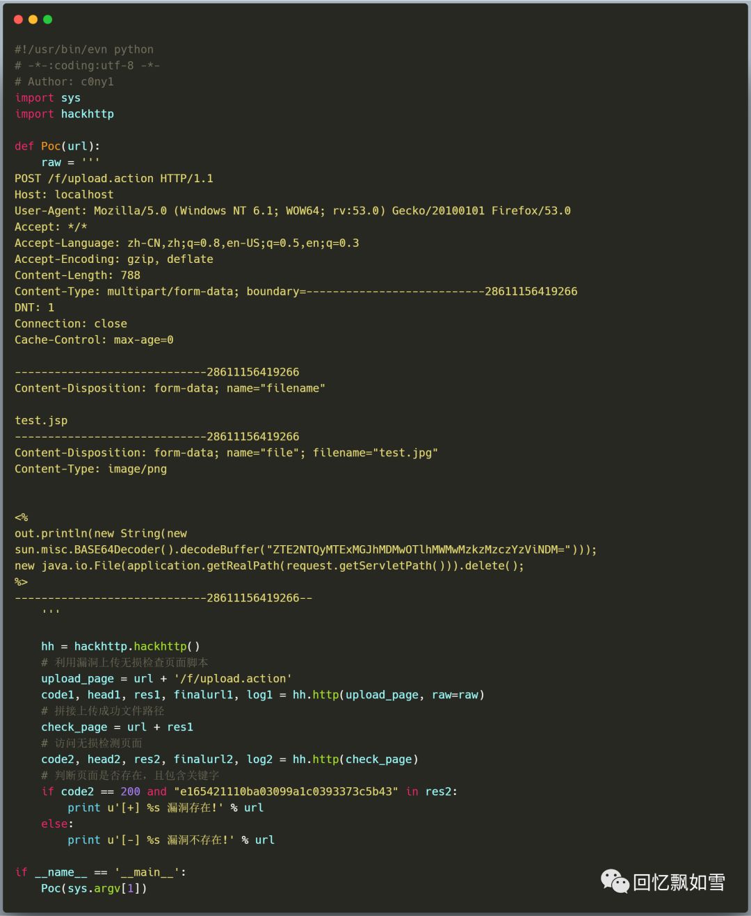 利用无损检查的思想去编写Poc,会使得检查方式更加优美。下面以我审计出的一个任意文件上传漏洞的poc为例子。