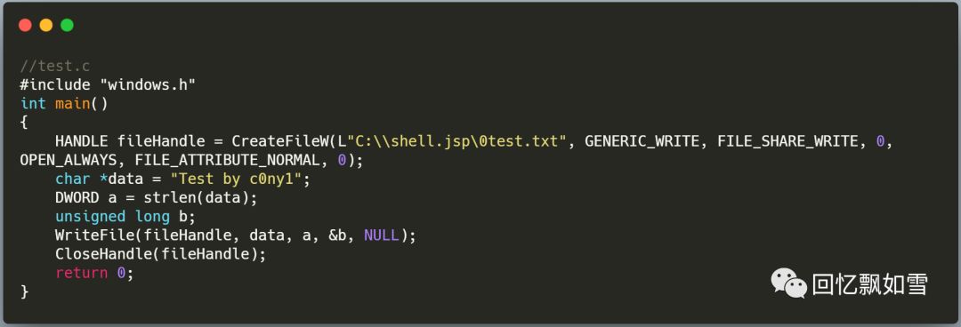 按照winFileHandleOpen方法的逻辑,无论如何最终都是调用了CreateFileW这个Windows API函数来创建文件。由于这个过程中均未对\00字符串进行过滤,如果传入的文件路径带有\00字符,则CreateFileW函数在创建文件时,路径会被截断。这没什么好说的。