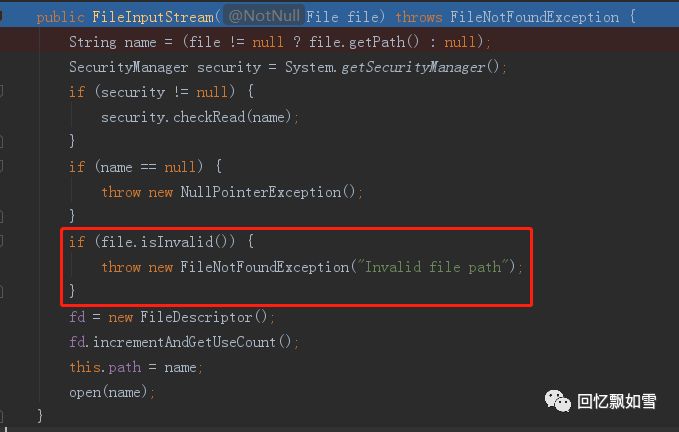 我们继续按照原来漏洞触发的调用链重新跟踪一遍,跟踪到第二构造函数时,发现多了一个针对文件路径的检查,若检查结果为非法,则抛出异常Invalid file path.