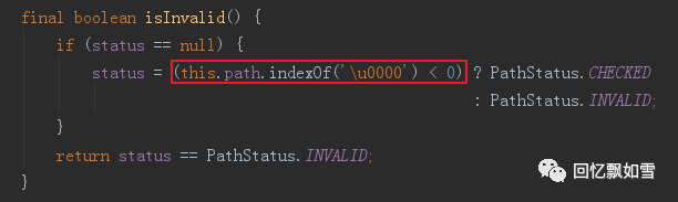 继续跟进,来到java.io.File类的isInvalid方法,发现该检查函数判断了路径中是否包含00字符串。(注意:java默认编码为Unicode,00字符串的Unicode编码为\u0000)。