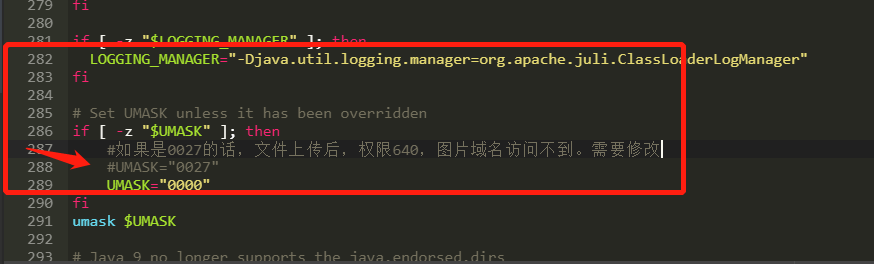 但Linux系统umask的默认值是0022,也就是说创建的文件应该是644的权限,而上传的文件却是640的权限。后来通过对查询Tomcat发现从tomcat8开始,catalina.sh文件中有下面几行代码