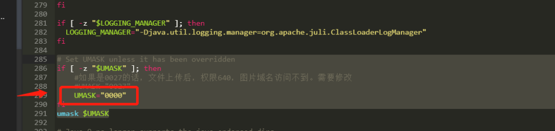 于是根据文章提示,找到自己tomcat的catalina.sh文件,大概在286行左右,如下图: