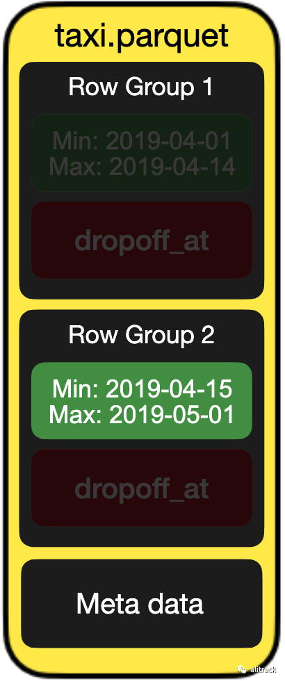 在这里我们可以充分利用 Parquet 文件中的统计数据。可以跳过最大值pickup_at