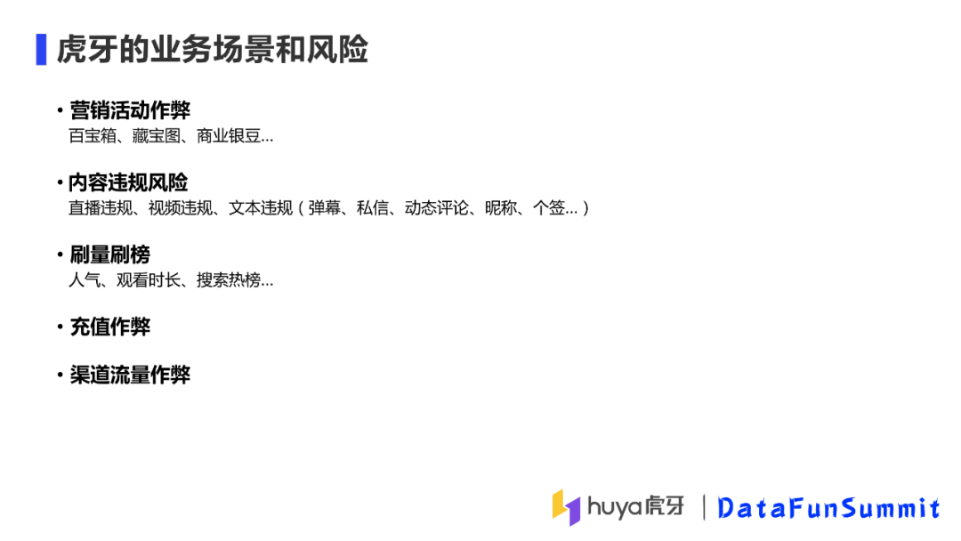 现在虎牙的主要业务场景及其潜在的风险有几种:第一种是营销活动作弊,比如百宝箱、藏宝图、平台的商业银豆等;第二种是内容违规风险,包括直播违规、视频违规、文本违规等;第三种是刷量刷榜,比如虚假搜索问题、虚假人气问题;第四种是充值作弊和渠道流量作弊。