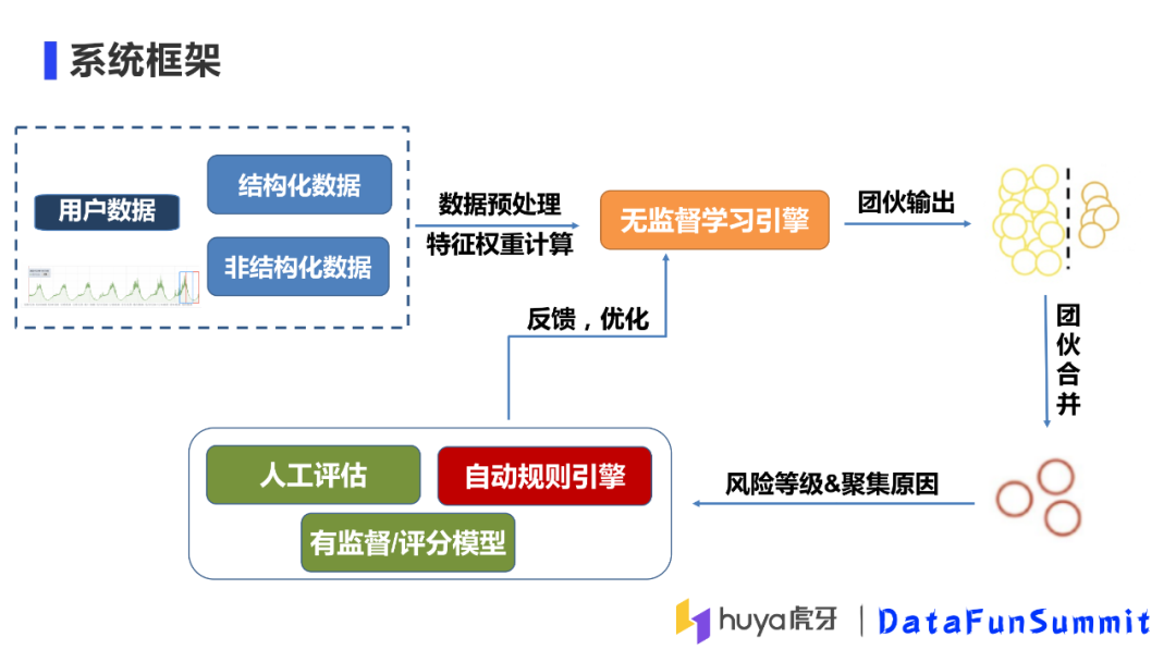 上图是整体的系统框架,我们首先会收集一定时间窗口内数据,包括结构化数据和非结构化数据,再进行数据预处理、特征工程,最后将数据输入到到无监督学习引擎。无监督学习引擎会输出团伙信息,这些团伙会与系统现有团伙进行合并,最终输出每个团伙的风险等级及其聚集原因。这些输出结果的用处有三个:第一个是自动化规则引擎会根据团伙的信息做自动化风控,比如生成策略、进行拦截等等;第二个我们会对团伙进行人工抽检评估,检验是否有误杀情况,并将结果反馈到算法,进行迭代优化;第三个是将用户所属的团伙信息作为用户的画像因子,提供给后续的有监督评分模型。