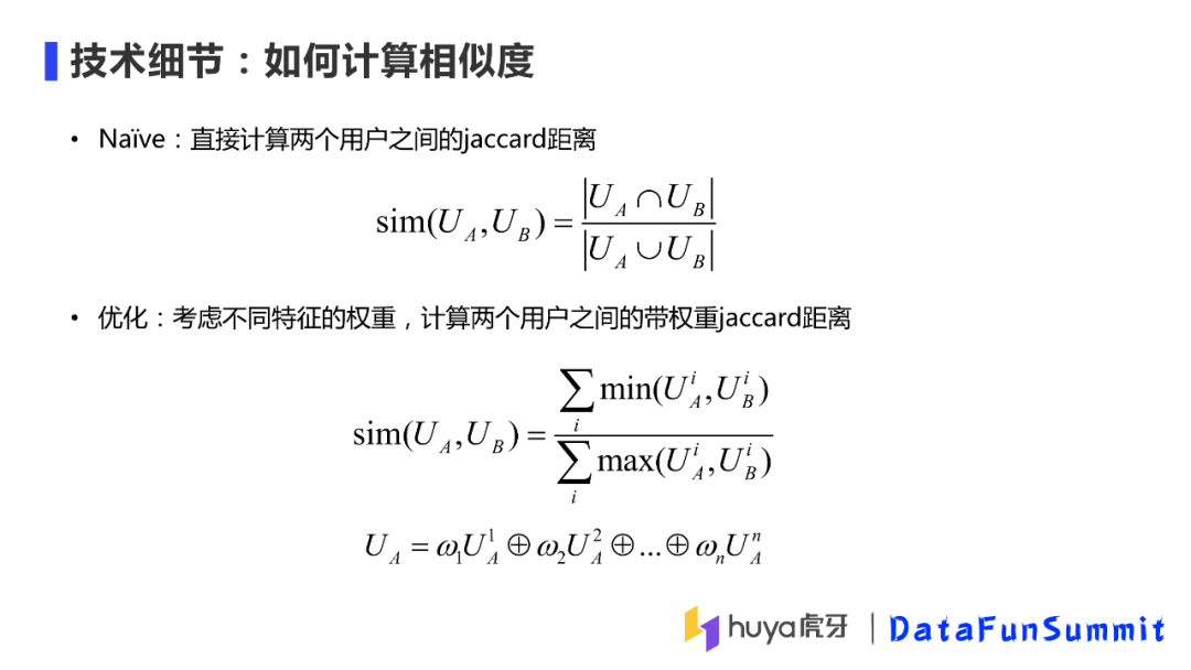 一种naïve的方式是默认所有特征的权重一样,直接计算两个用户的jaccard距离,用该距离来表示用户之间的相似度。但是这种方式是不合理的,因为不同特征的重要程度不同,比如ip相同的两个用户显然比手机号城市相同的两个用户的关联程度要大,所以在实际计算中我们会给不同的特征赋予不同的权重,通过带权重的jaccard距离来表征用户之间的关联。