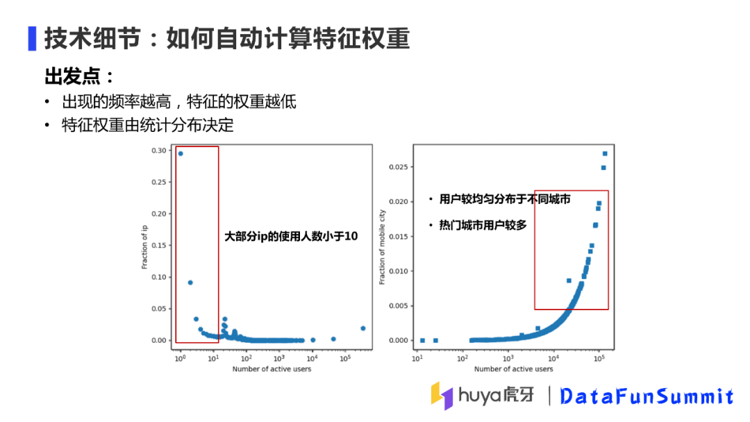 不同特征的权重如何确定呢?在实际处理的时候,如果一个特征出现的频率越低,那么它的权重应该越高,比如单个IP出现的频率很低,则IP的特征权重应该比较高。但是类似手机号城市这种特征,出现的频率高,则权重则相应比较低。其次,特征的权重也受其统计分布影响,上图中分别给出了IP和手机号的分布图,大部分IP的使用人数小于10,使用人数成指数衰减分布,而手机号分布相对均匀,热门城市用户会多一些。综上两点,我们会根据特征出现的频率及分布情况确定特征的权重。
