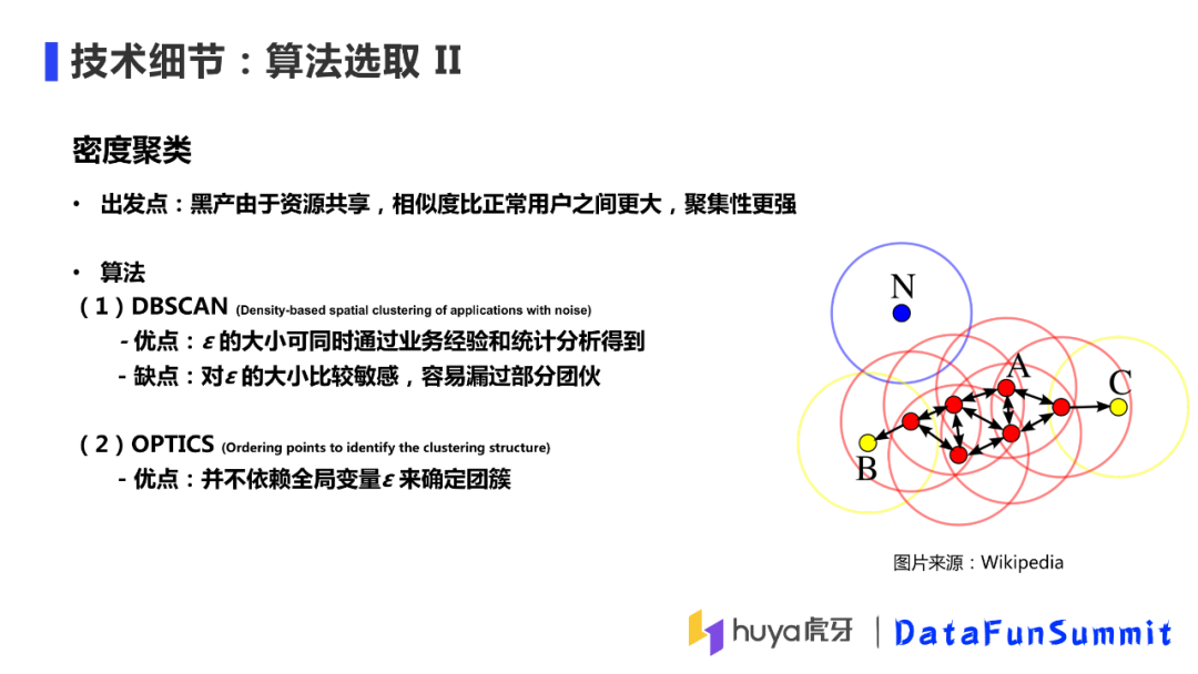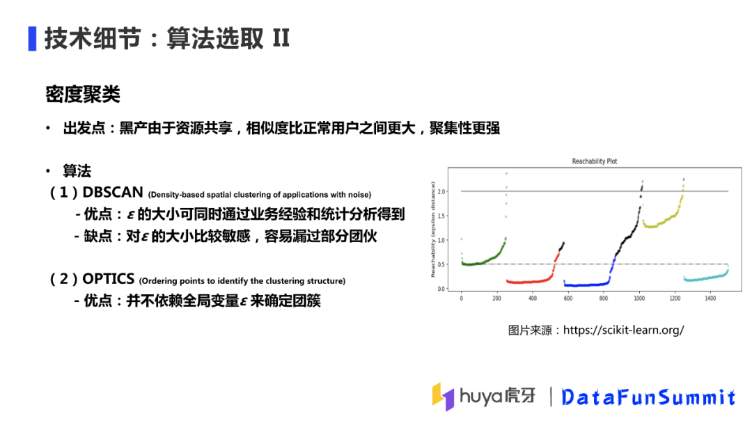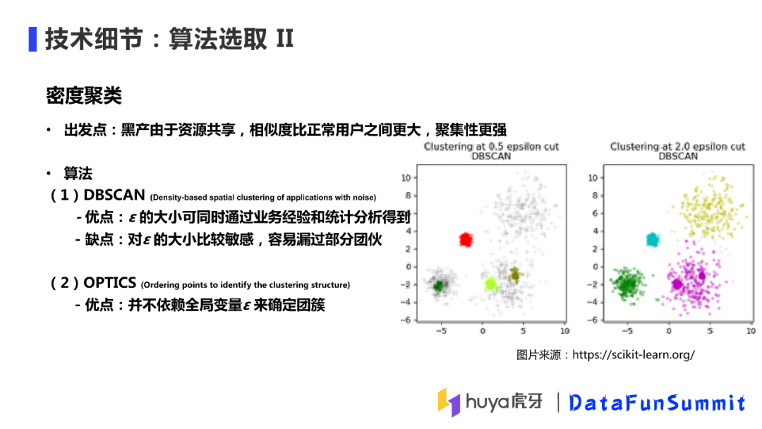 第二类尝试的算法是密度聚类,我们的出发点是黑产攻击过程中由于资源共享,黑产用户之间的相似度会比正常用户相似度要大,聚集性更强,所以密度聚类能有效捕捉这种攻击方式。我们主要是试验了以下两种算法: