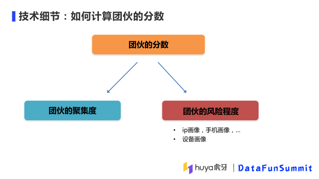 如何对算法输出的团簇进行打分呢?团伙分数由两部分组成,一个是团伙的聚集度(由团伙内成员参数的聚集度决定),一个是团伙的风险程度(团伙内成员使用IP、设备画像等决定)。
