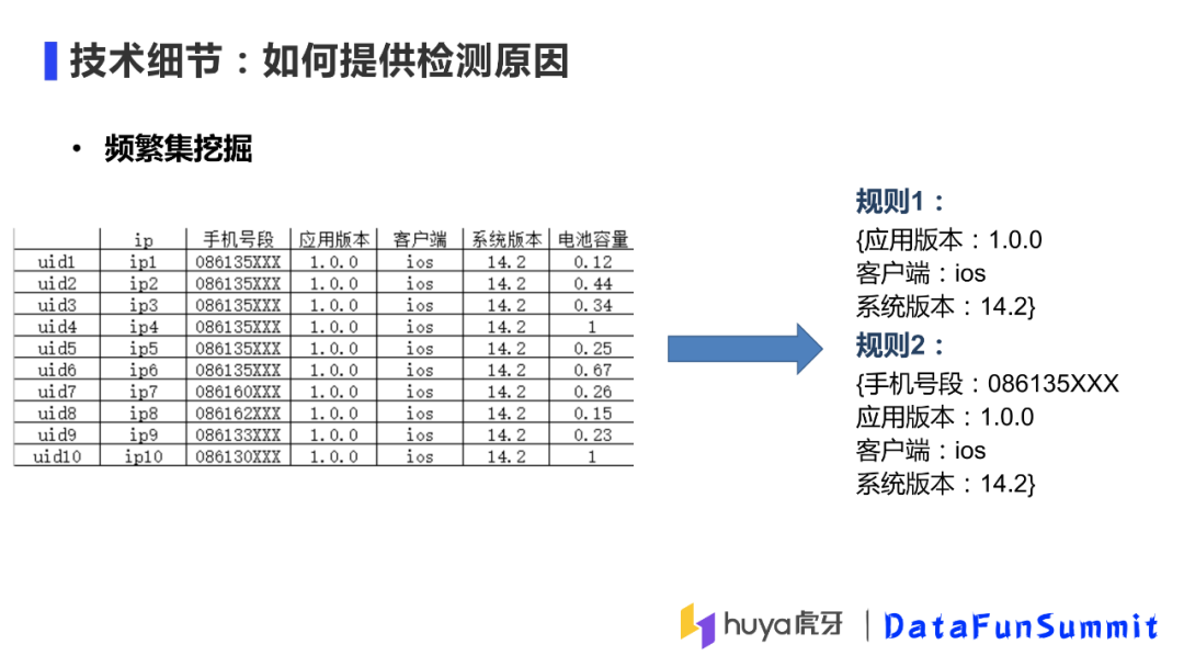 我们不仅需要算法输出可疑团伙,同时还需要输出黑产团伙的聚集原因。在可解释性方面我们使用了频繁集挖掘方法,即找到数据集中出现的频率不小于某一阈值的子项目。比如上图中,若设置频率阈值为1,则得到规则1。如果将阈值放宽到0.5,则可以得到规则2。