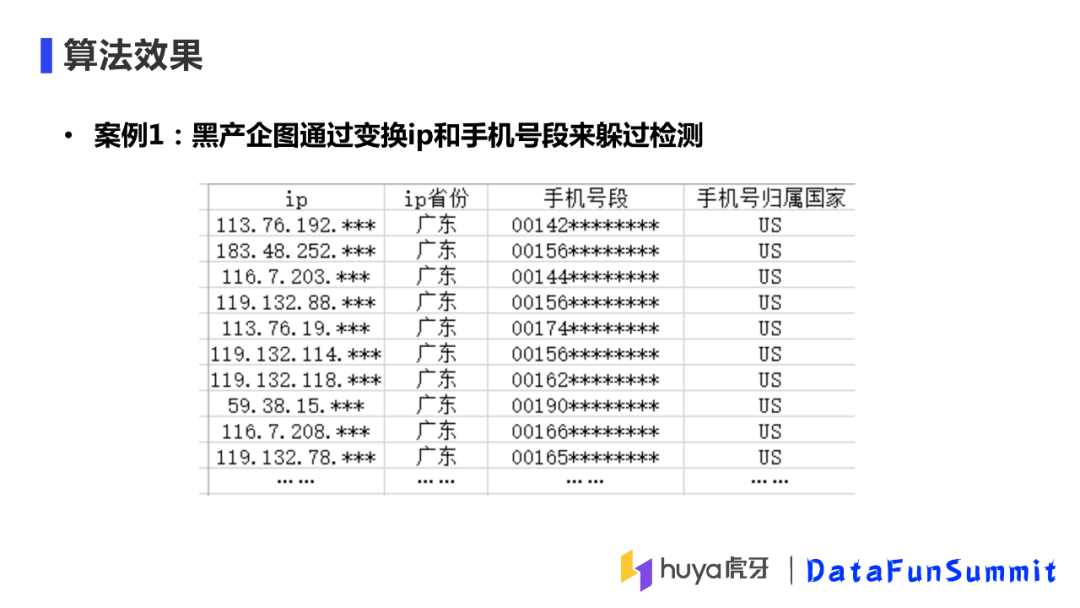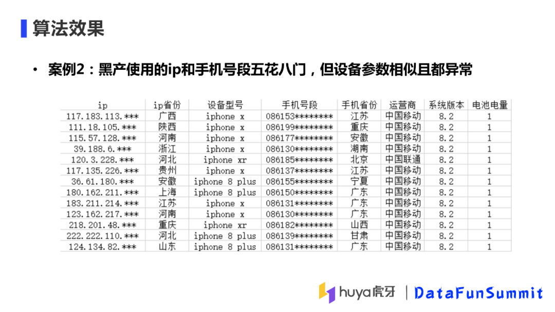 最后,与大家分享在实际操作中算法找到的两个黑产团伙。第一个案例中,团伙的IP十分分散,手机号段也不重复,所以仅从IP、手机号段的频次检测是无法找到这个的团伙的。但是我们发现虽然用户使用的IP都不一样,但是IP都属于广东,手机号都是美国手机号,所以通过综合分析我们找到了该团伙。