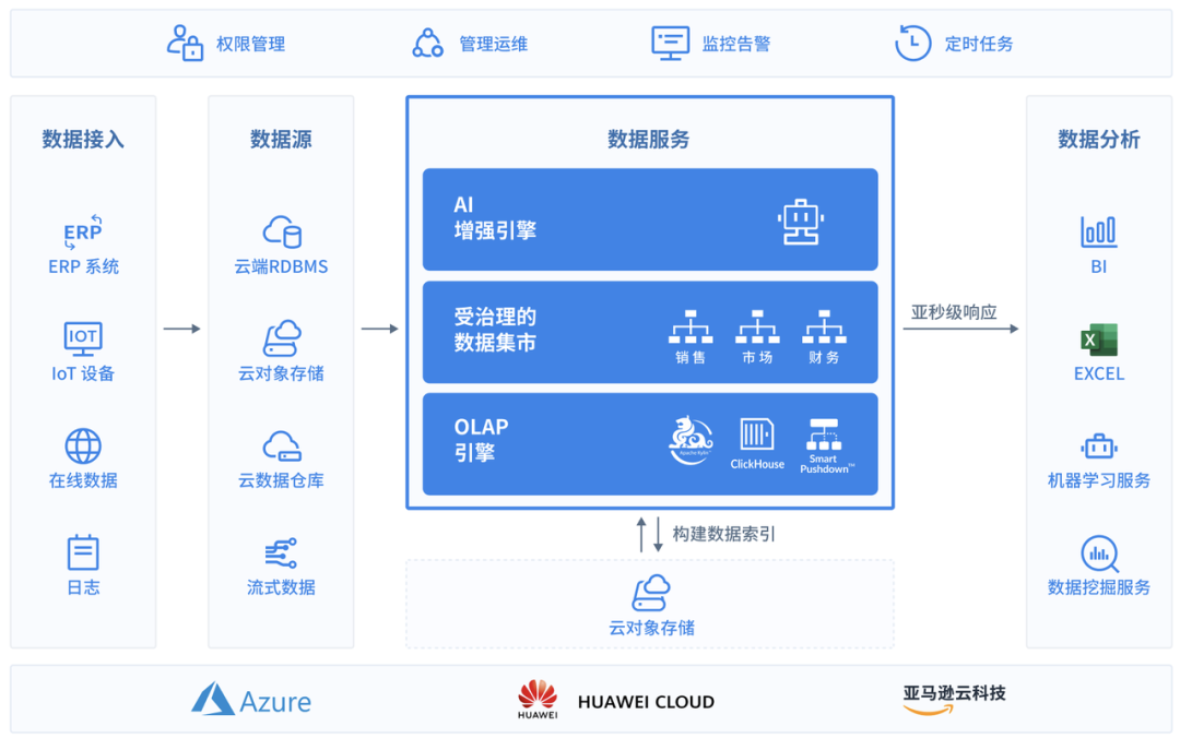 统一语义层将复杂的数据映射为业务语言,并以服务的形式为每一个数据分析用户在 PB 级别数据规模上,提供统一的数据定义及行业标准的访问接口(标准 SQL 及 MDX)。
