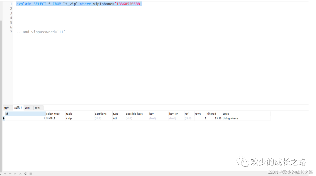 explain SELECT * FROM `t_vip` where vipIphone='18360520588'
