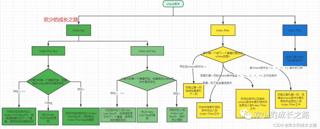 1)若存在并且条件是=、>=,则将对应的条件加入Index First Key之中,继续读取索引的下一个键值,使用同样的提取规则;
