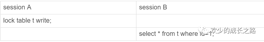 sessionA先对表t加了一个写锁。sessionB要准备执行对表t的读取操作。读取一个表是需要获取MDL读锁的。这样为了防止脏读。所以发现了锁等待现象。