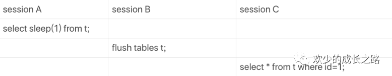 sessionB开启一个flush表B的操作。flush之前要对表t进行关闭。而表t又在sessionA中睡眠。session就被sessionA堵住了。