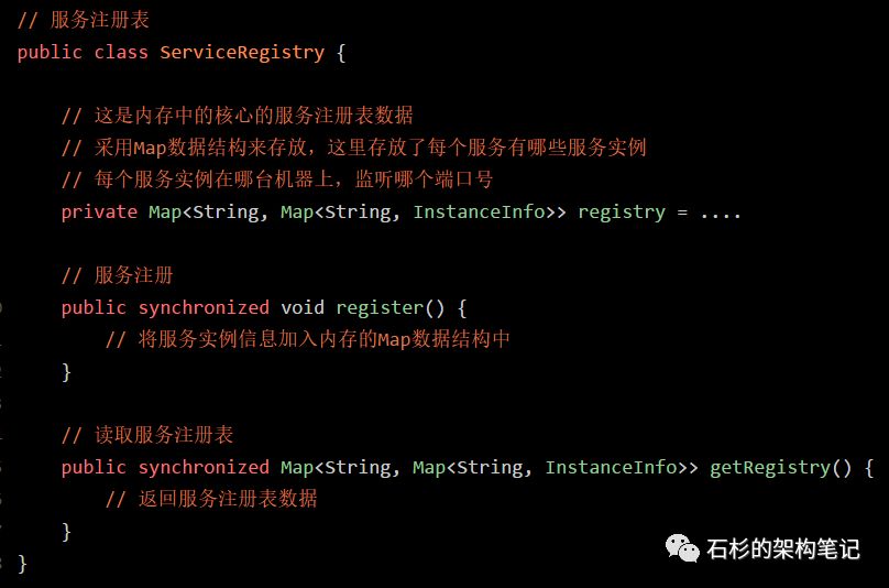 先来看看下面的图,现在我们知道一个微服务注册中心(可以是Eureka或者Consul或者你自己写的一个微服务注册中心)肯定会在内存中有一个服务注册表的概念。