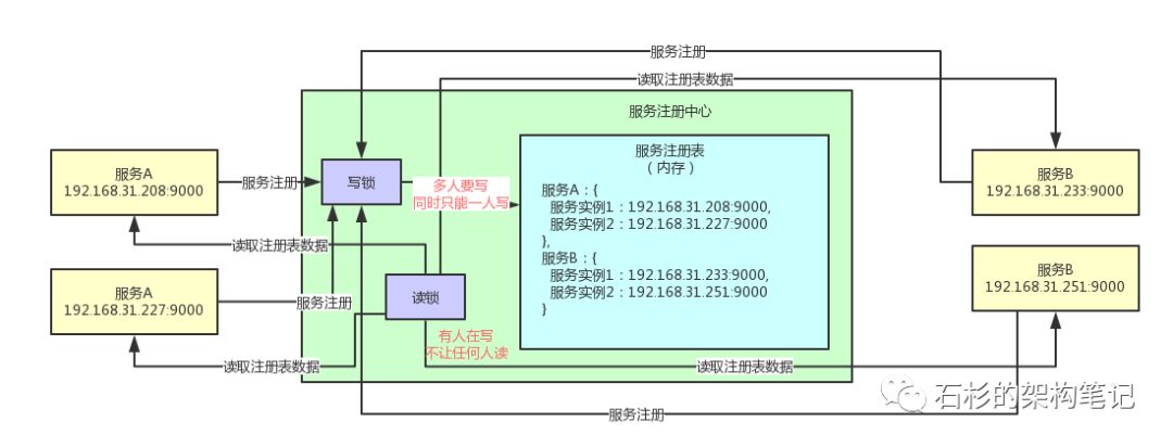 然后,有人在读服务注册表的数据的时候,其他人都可以随便同时读,但是此时不允许别人写服务注册表数据了!