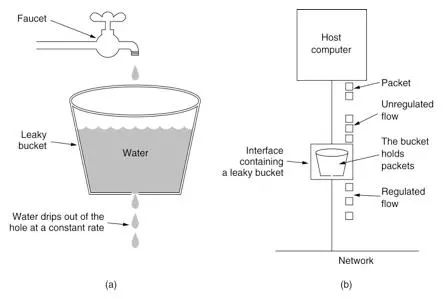 漏桶算法思路很简单,水(也就是请求)先进入到漏桶里,漏桶以一定的速度出水,当水流入速度过大会直接溢出,然后就拒绝请求,可以看出漏桶算法能强行限制数据的传输速率。示意图(来源网络)如下: