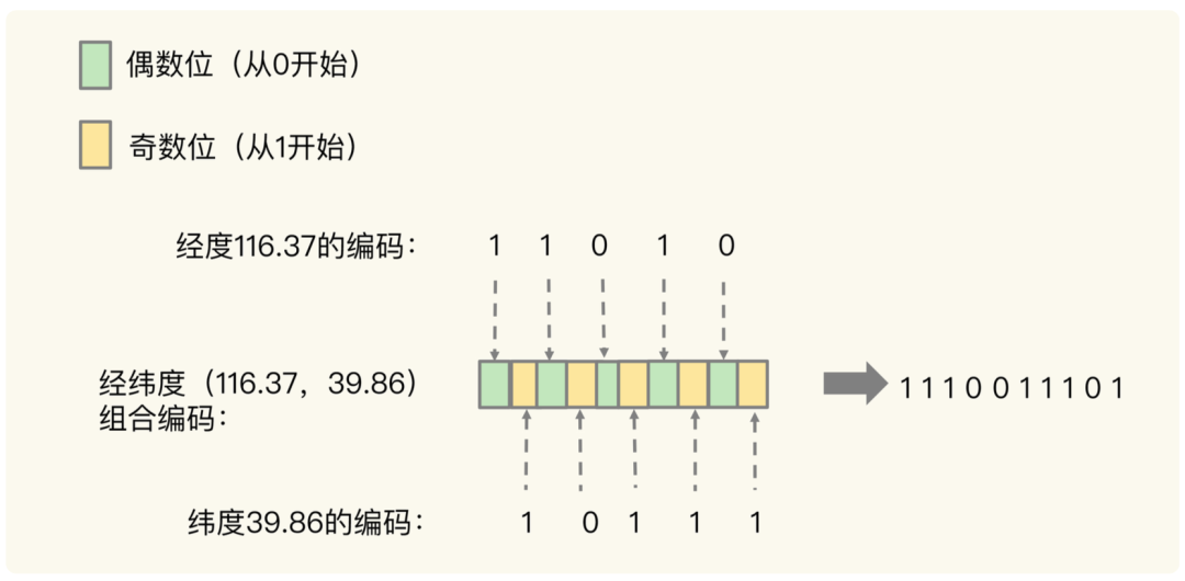 我们刚刚计算的经纬度(116.37,39.86)的各自编码值是 11010 和 10111,组合之后, 第 0 位是经度的第 0 位 1,第 1 位是纬度的第 0 位 1,第 2 位是经度的第 1 位 1,第 3 位是纬度的第 1 位 0,以此类推,就能得到最终编码值 1110011101,如下图所示