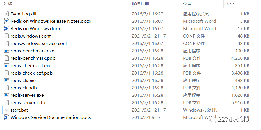 新建start.bat文档,写入内容:redis-server.exe redis.windows.conf