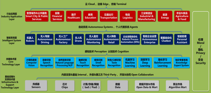 目前技术层中的核心技术主要由科技巨头企业掌控,如微软、亚马逊、 Google、Facebook、百度、阿里、腾讯、京东、小米、商汤等。此外,一大批初 创企业和开源组织也陆续加入其中。它们共同探索和推进 AI 技术的发展,催生 出了一批在业内有深远影响力的开源项目,如 TensorFlow、PaddlePaddle、Caffe、 CNTK、Deeplearning4j、PyTorch 、Mahout、MLlib。这些科技企业,通过招募 AI 高端人才及组建实验室等方式加快关键技术研发,并通过开源技术平台构建生态体系。