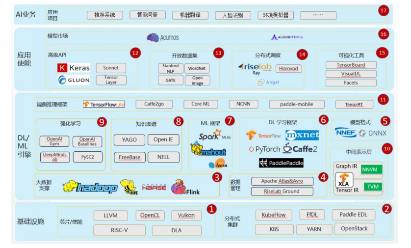 上图是目前比较活跃的机器学习及深度学习的开源社区及项目所形成的开 源全栈示意图,整个开源全栈被分为四个层次: