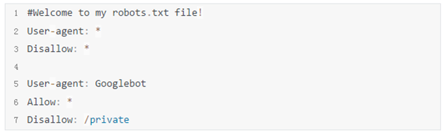 在上面这个 robots.txt 例子中,所有的爬虫都被禁止访问网站的任意内容。但是 Google 的爬虫机器人,可以访问除了 private 位置的所有内容。
