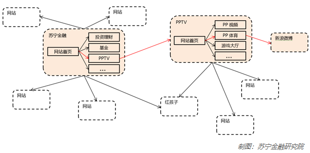 同时,这些网页往往又链接了很多外部网站。例如,用户从苏宁金融的网页为起点,浏览发现了 PP 视频的链接,点击后跳转到了 PP 视频主页,作为体育爱好者,在体育频道中找到了相关的新浪微博的内容,再次点击后又来到微博的页面继续阅读,从而形成了一条路径。