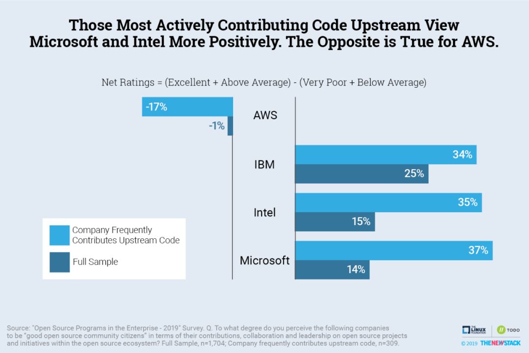 与所有受访者相比,最活跃的上游贡献者对微软和英特尔的看法更为积极;对AWS则相反。