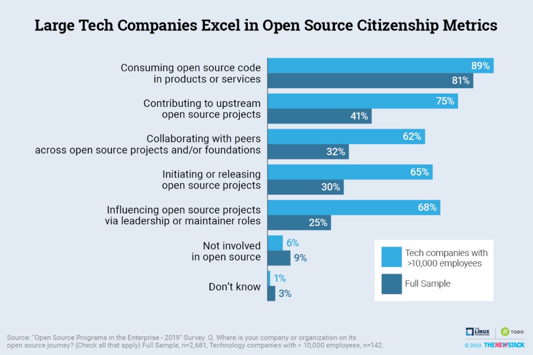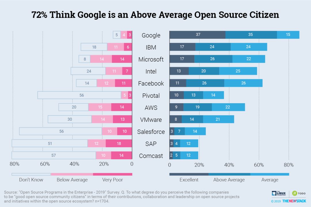 该研究将企业贡献、与他人的协作和领导力确定为“开源公民身份”的关键指标。然后根据这些指标来衡量社区如何看待11家公司的开源公民身份。2700人接受了调查,其中绝大多数人在某种程度上使用了开源,并且有一半人所在企业的商业产品经常使用开源技术。