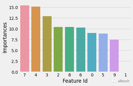 通过从 Catboost 模型中获取特征重要性的默认类型,可以观察到计算时间相对较短,正如预期的那样,由于方法的简单性。三个最重要的特征分别是 7、4 和 3。