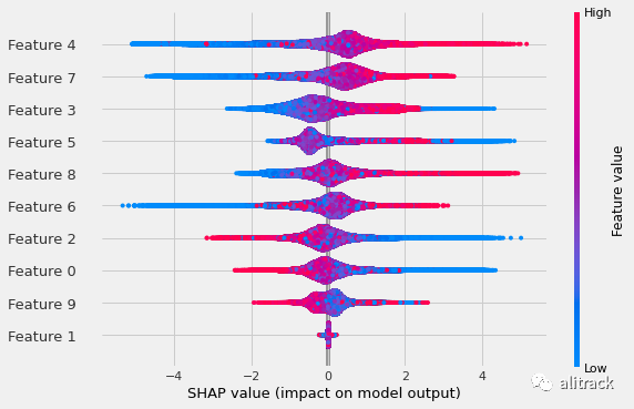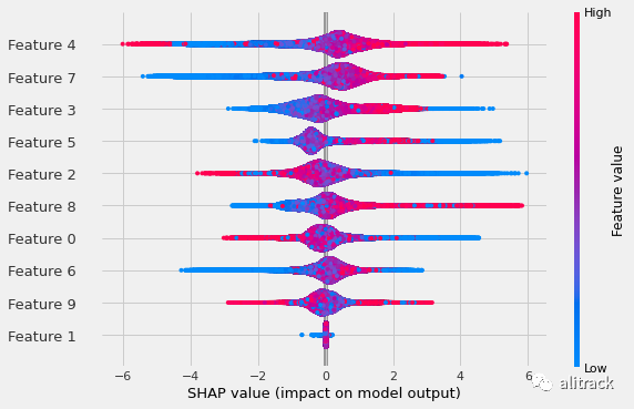 shapley 值的汇总图如下图所示。可以看出特征重要性和 shapley 值之间存在相关性,但它们并不相同,这是已经预料到的,因为它们是不同的方法。例如,对模型输出有影响的三个主要特征分别是 shapley 值的 4、7 和 3,以及特征重要性的 7、4 和 3。