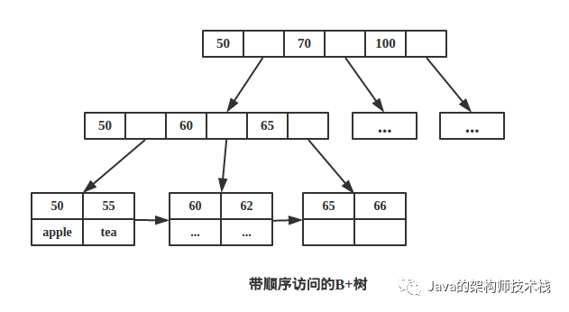 (2)B+树相邻接点的指针可以大大增加区间访问性,可使用在范围查询等,而B-树每个节点 key 和 data 在一起,则无法区间查找。