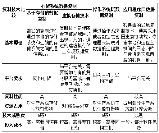 医院的业务系统按照容灾系统对应用系统的保护程度可以分为数据级容灾和应用级容灾, 数据级容灾系统只保证数据的完整性、可靠性和安全性,但提供实时服务的请求在灾难中会中断。应用级容灾系统能够提供不间断的应用服务,让服务请求能够透明(在灾难发生时毫无觉察)地继续运行,保证数据中心提供的服务完整、可靠、安全。因此对服务中断不太敏感的部分可以选择数据级容灾,以便节省成本,在数据级容灾的基础上构建应用级容灾系统,保证实时服务不间断运行,为用户提供更好的服务。下表是几种灾备技术的对比:
