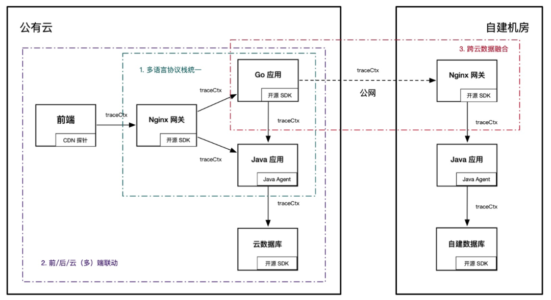 透传协议标准化:全链路所有应用需要遵循同一套协议透传标准,保证链路上下文在不同语言应用间能够完整透传,不会出现断链或上下文缺失的问题。目前主流的开源透传协议包括 Jaeger、SkyWalking、ZipKin 等。